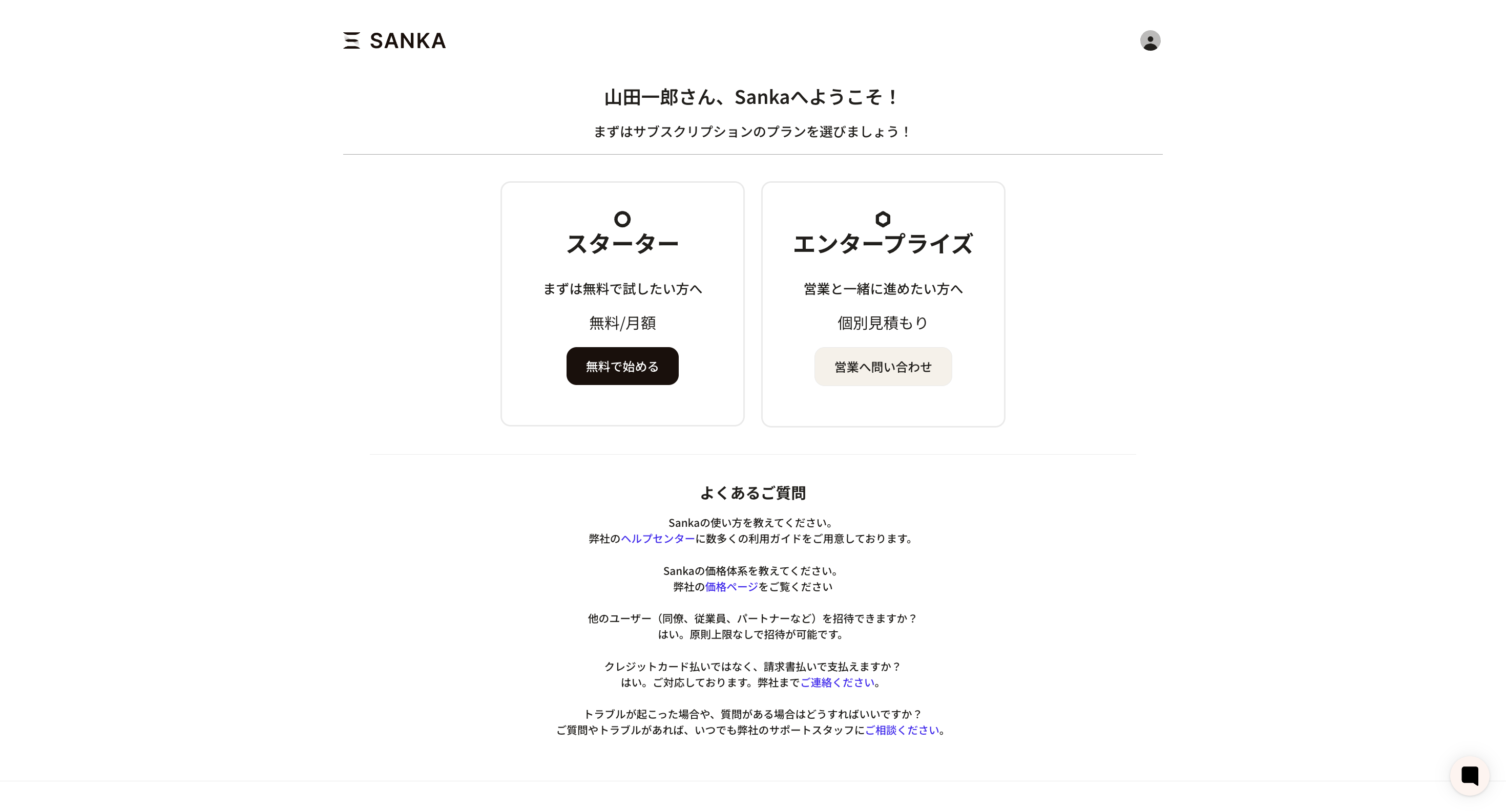 アカウントが作成されると、Sankaの価格プランの選択画面に移ります。