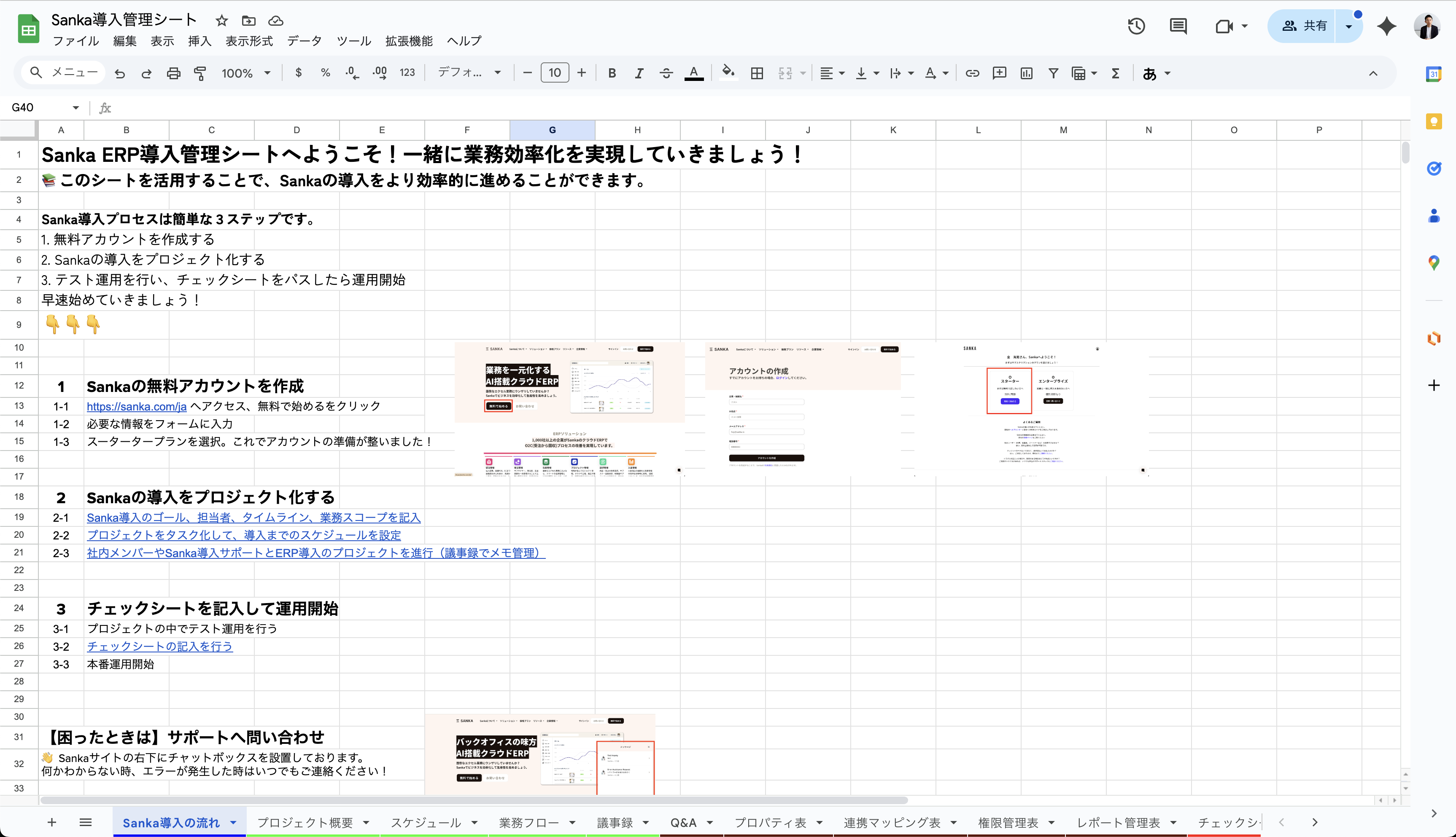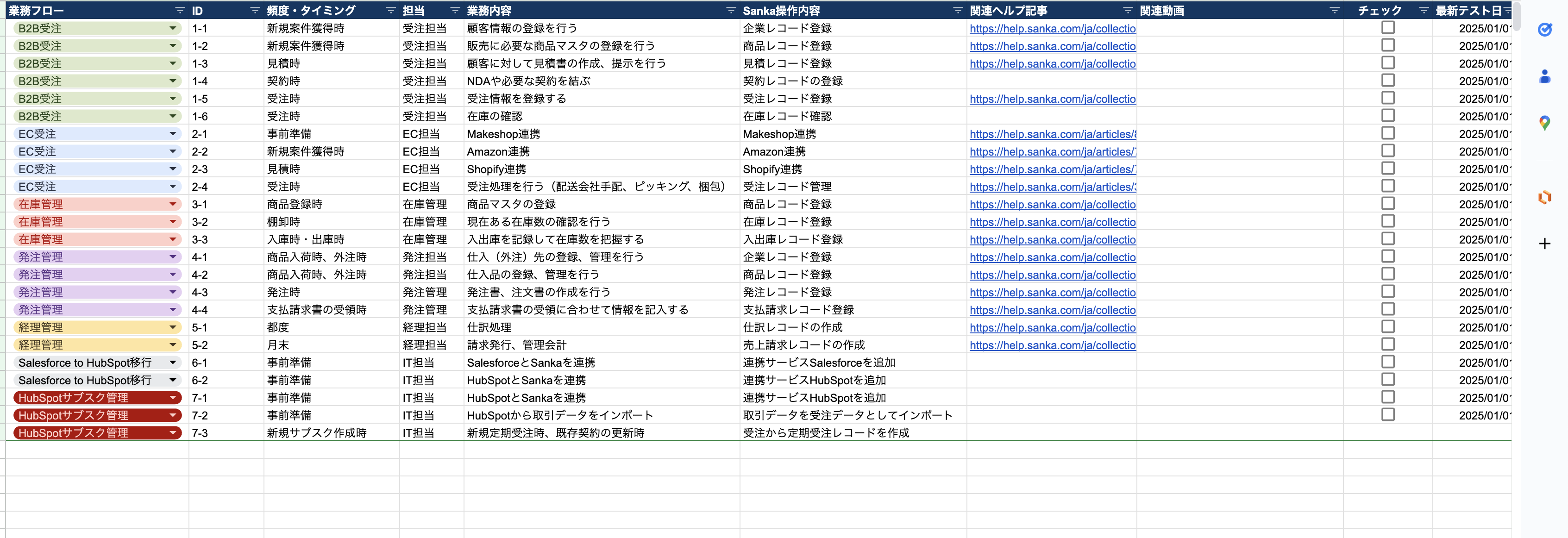 このシートでは、Sankaで実現できる業務フローと、その業務フローを実行するための機能詳細が書かれている関連ヘルプ記事リンクが揃っています。