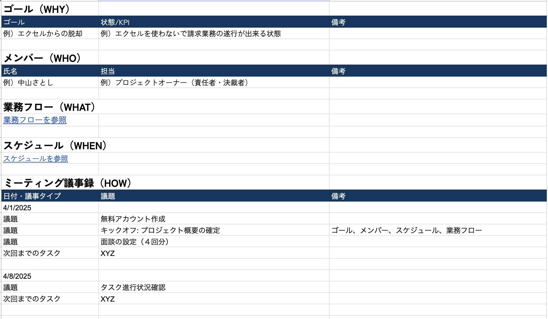 まずは導入の目的やメンバー、スケジュールや業務フローをシートに記入していきます。