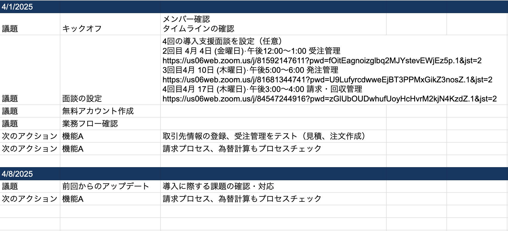 以下は議事録のスクリーンショットですが、定例会で現在の課題やスケジュールをディスカッションしていき、本番運用までプロジェクトを進めることで過去の議論内容を確認できるので、導入がスムーズに進みます。