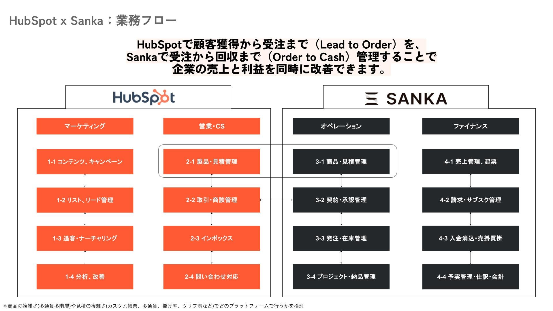HubSpot CRMとSanka ERPを連携することで、フロントオフィスとバックオフィスがシームレスに連動される唯一無二のトータルソリューションを提供できることになっております。