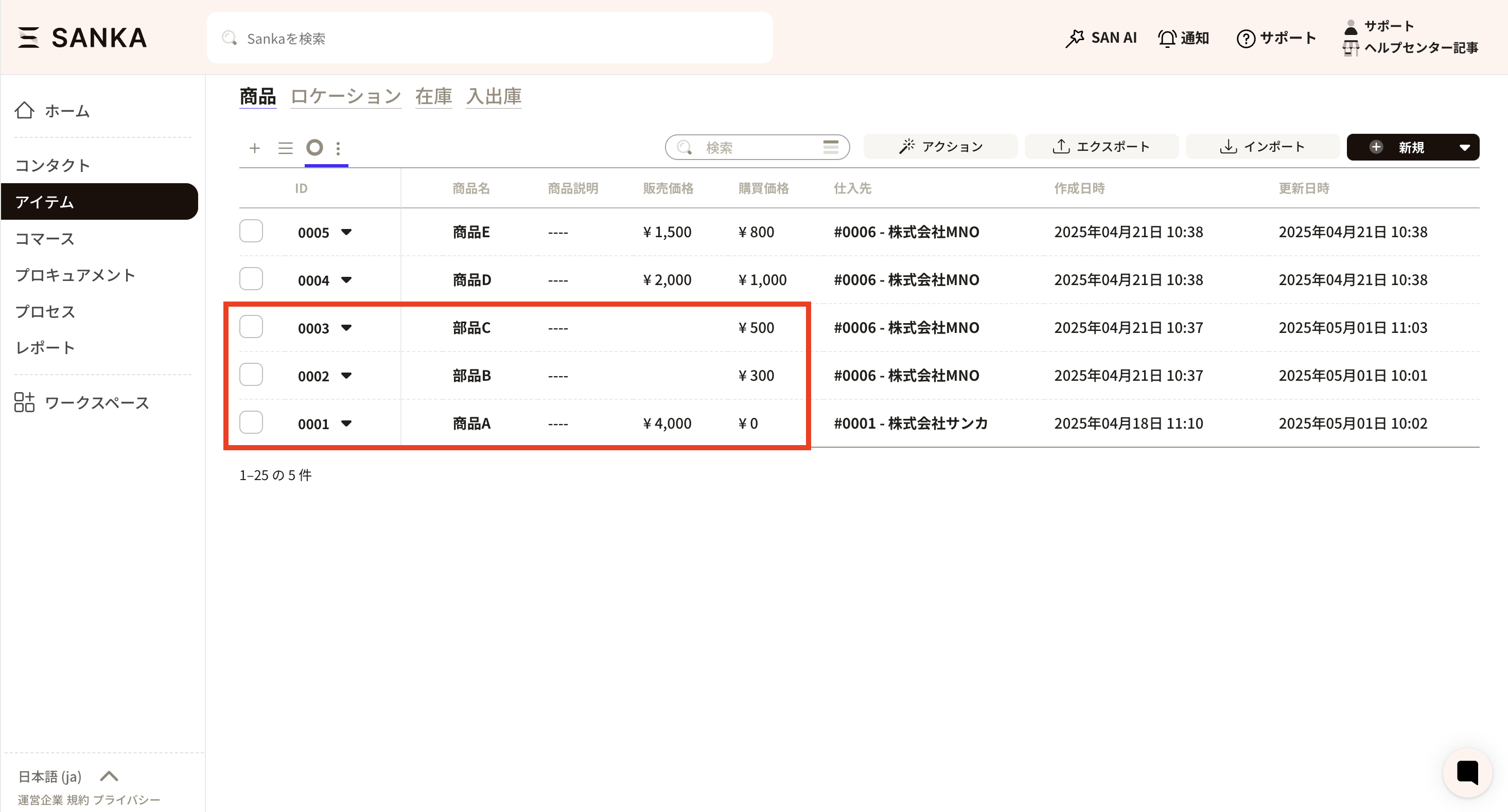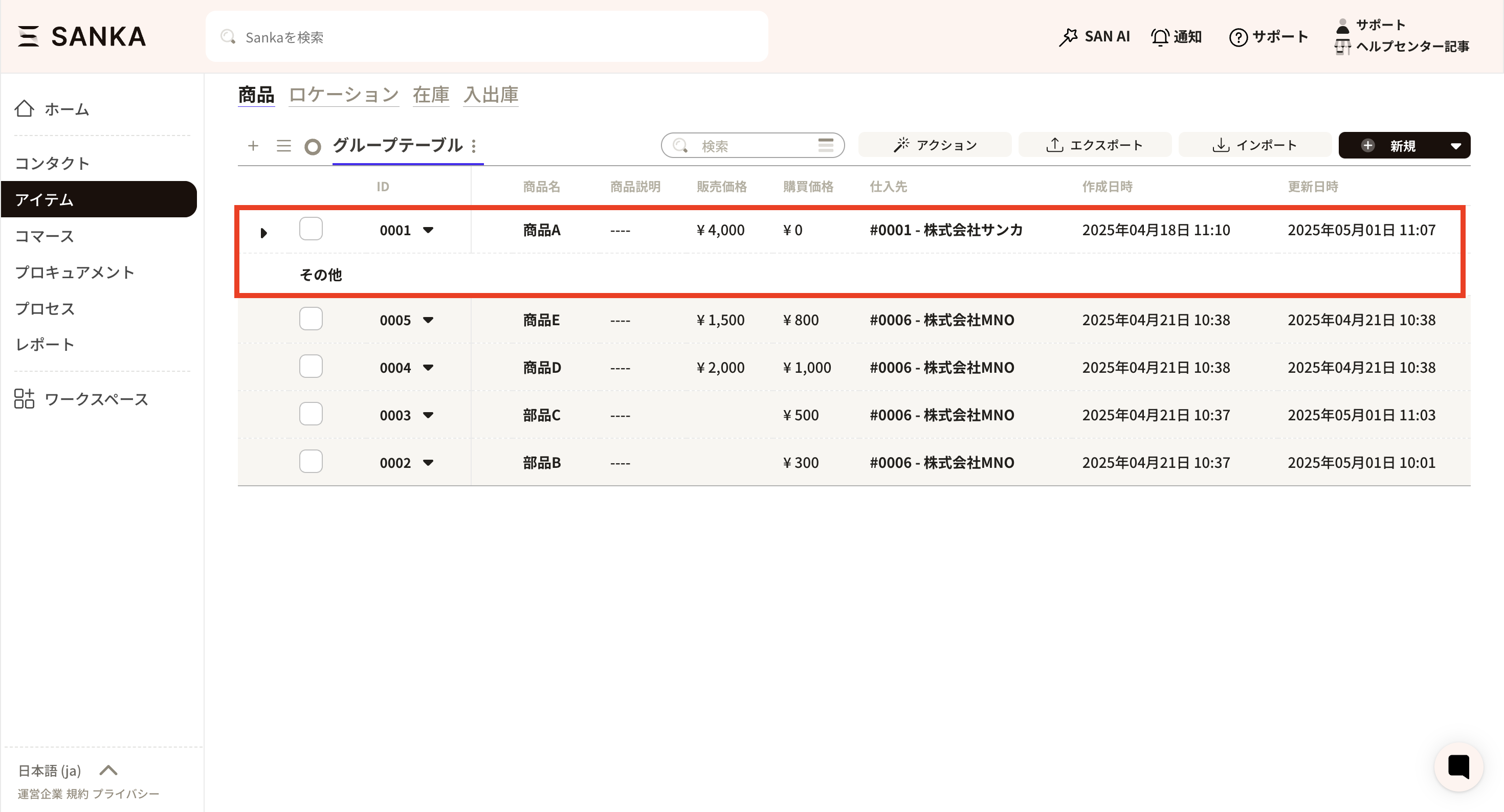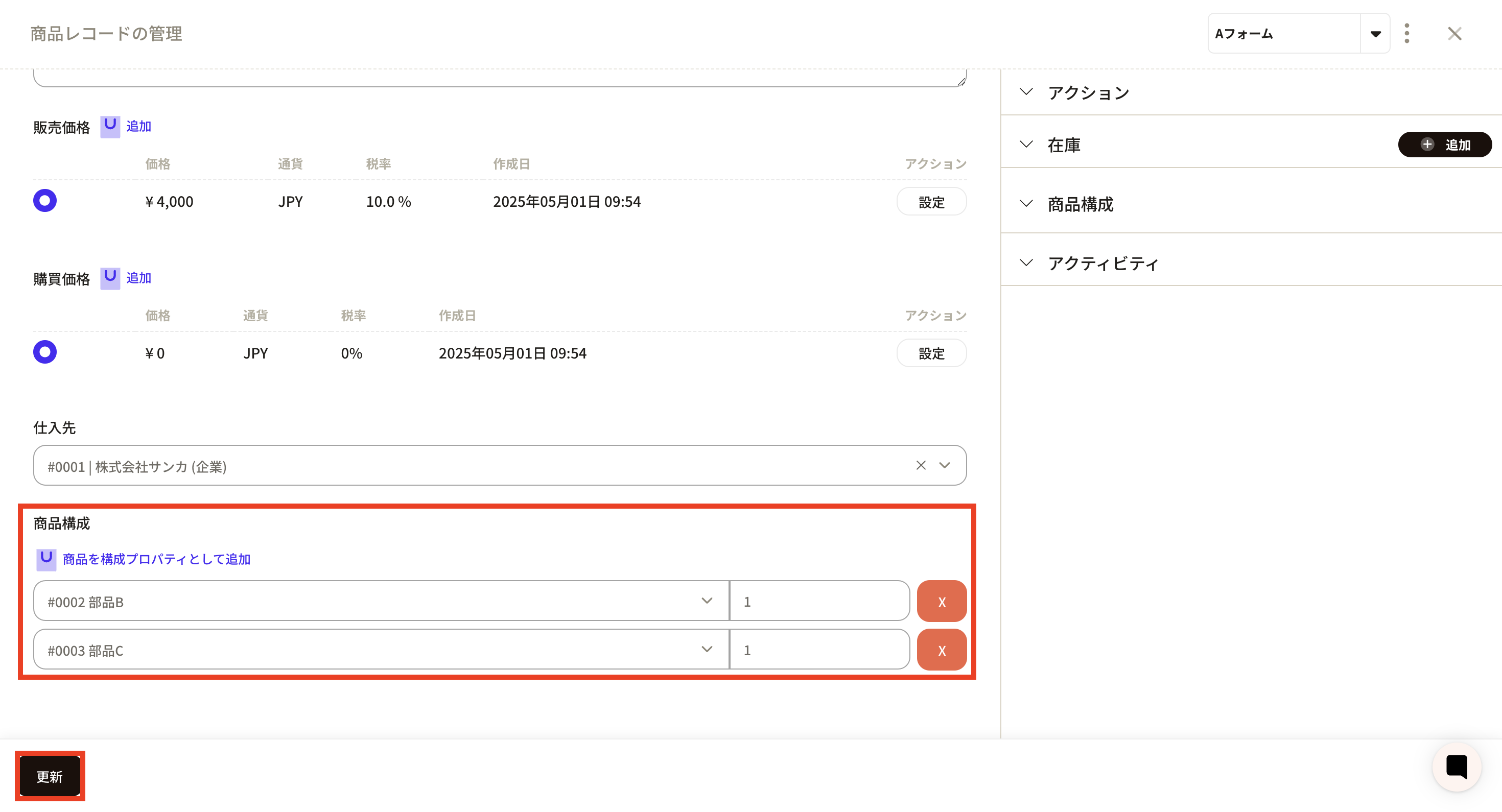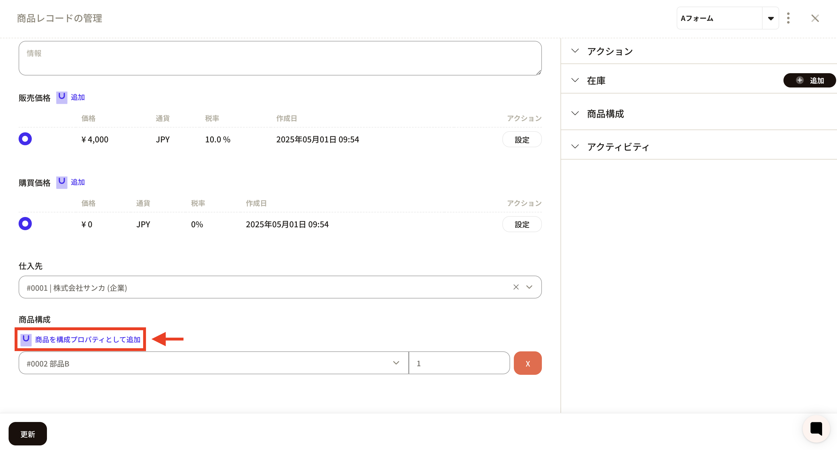 ④ A frame for linking product configurations will appear, so enter the product and quantity to be linked. When you click on the product frame, already registered product records will be displayed and you can select the appropriate product. Here we selected part B.