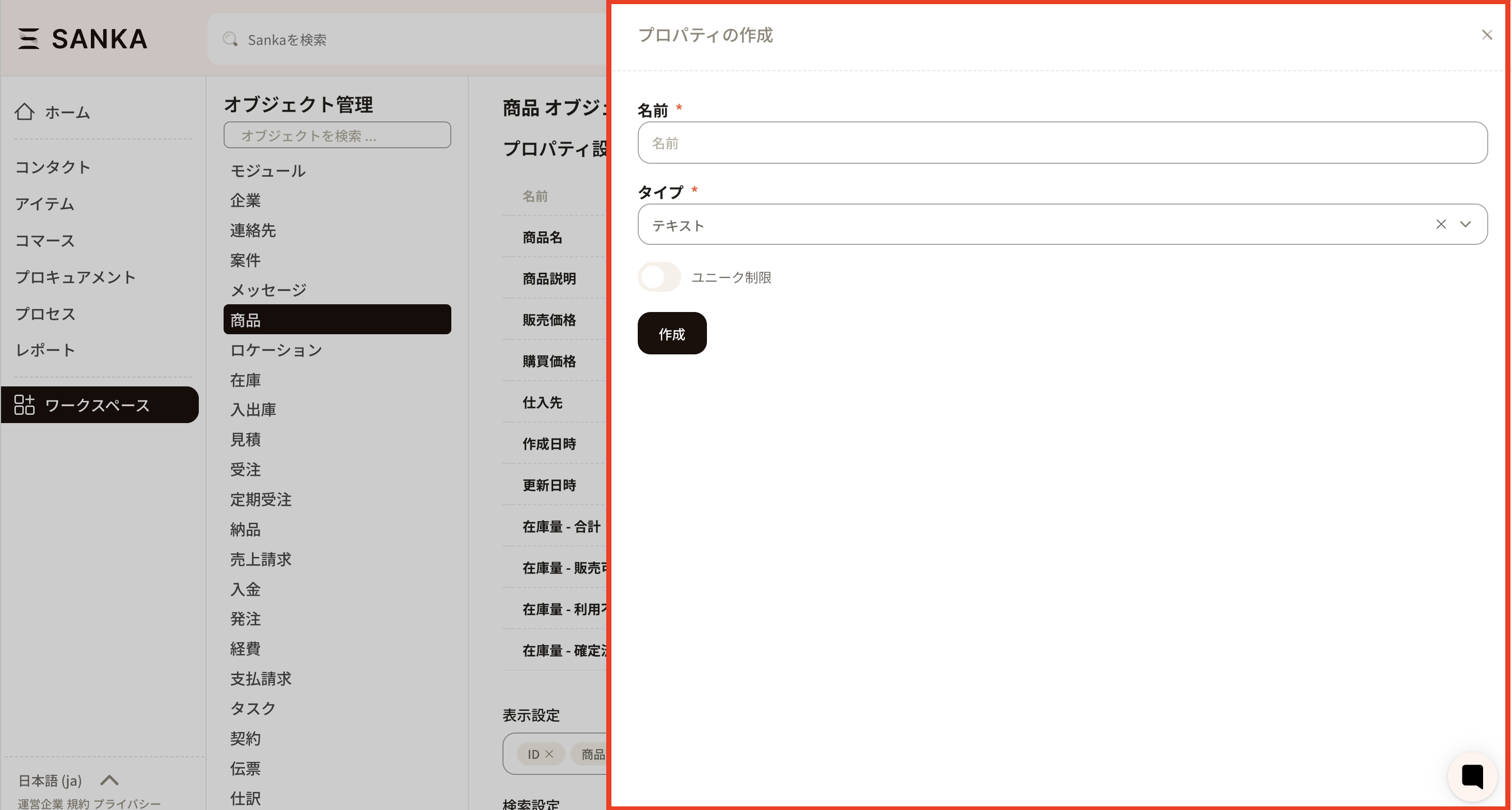 ⑫ Click the new registration button from the product object and click the form name you just created to confirm that the product configuration property has been added.