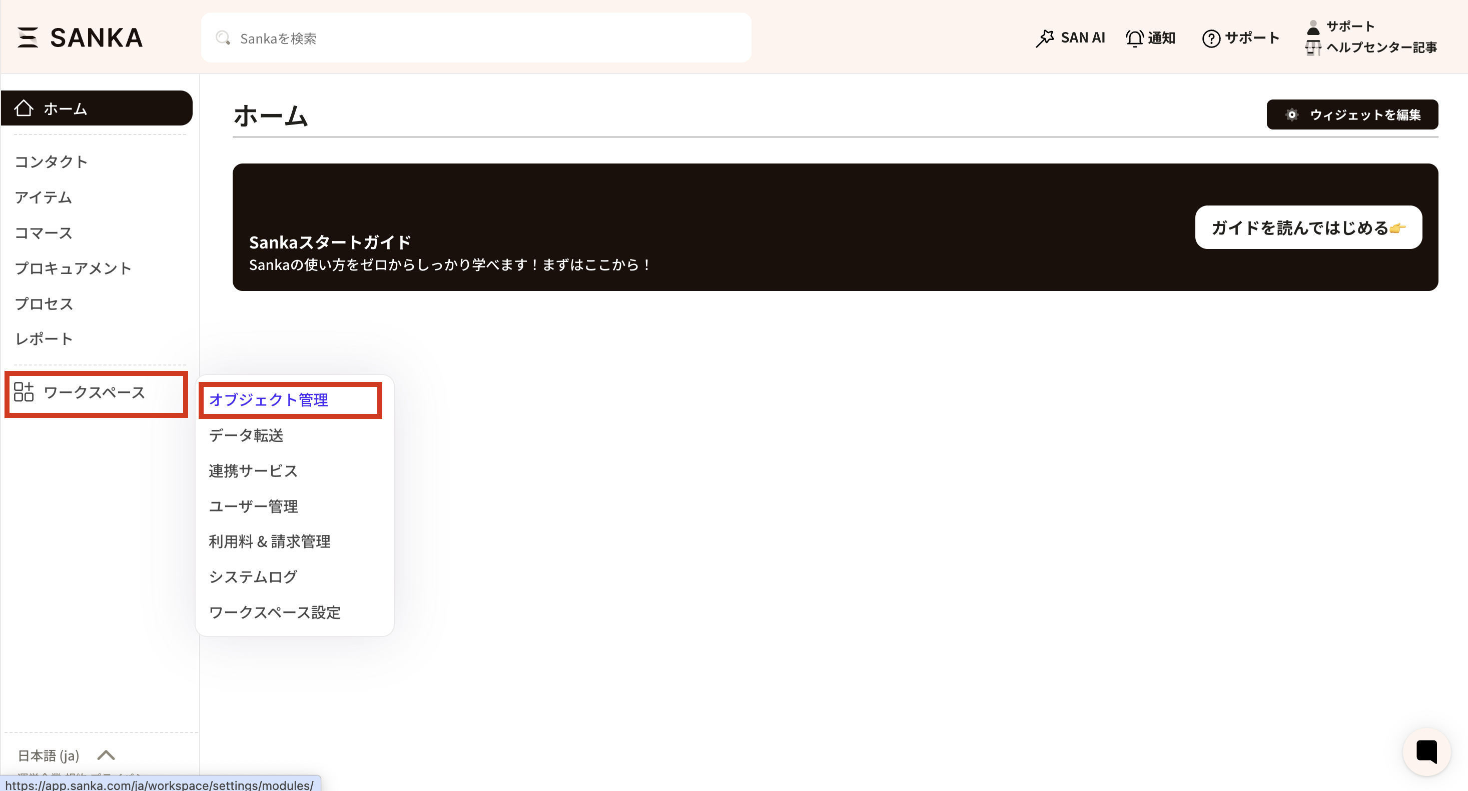 ② Select "Product" from the "Object Management" menu to display the properties (management items) currently set for the product object.