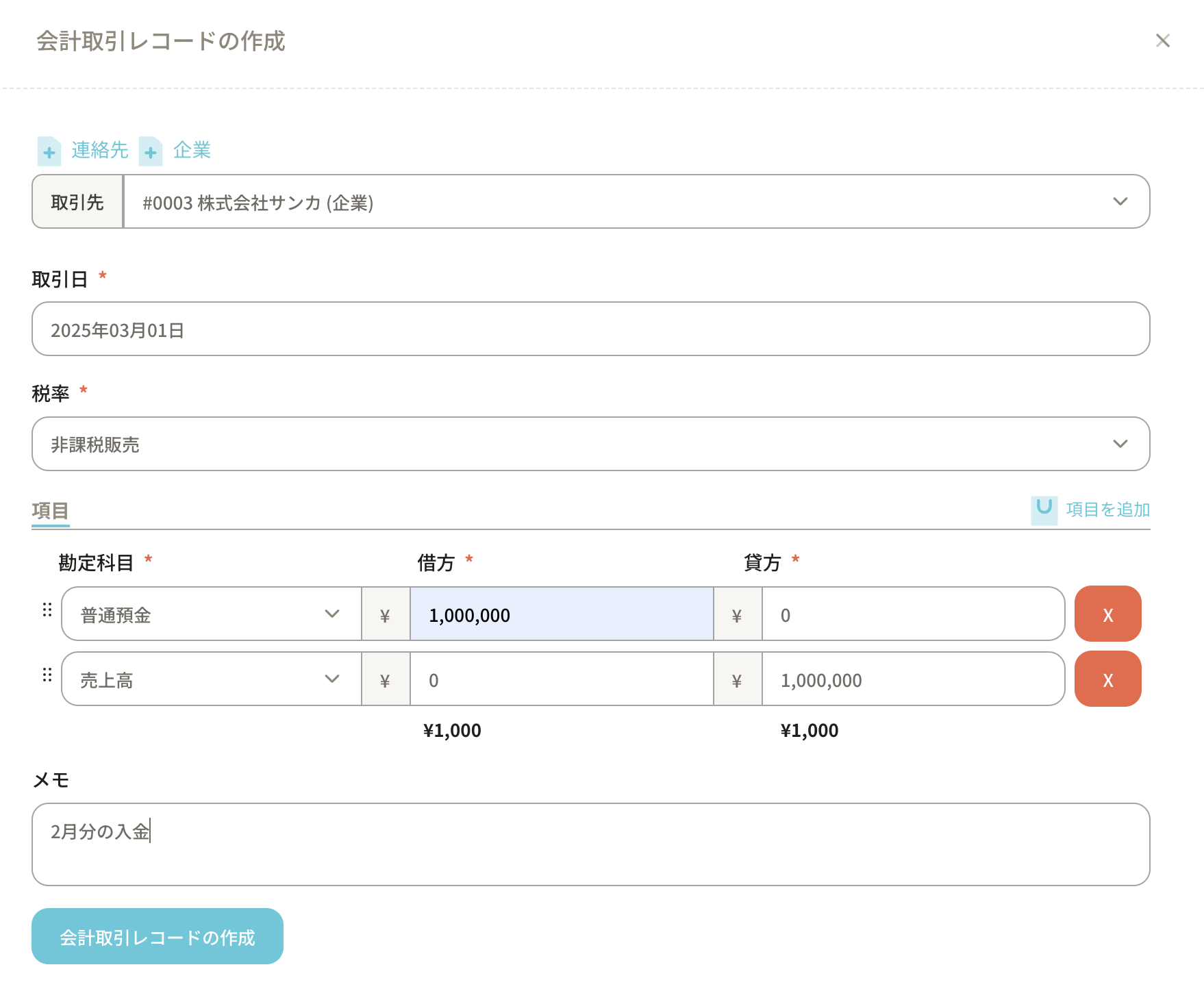 **② The "Create journal record" menu will be displayed, so enter the necessary information. **