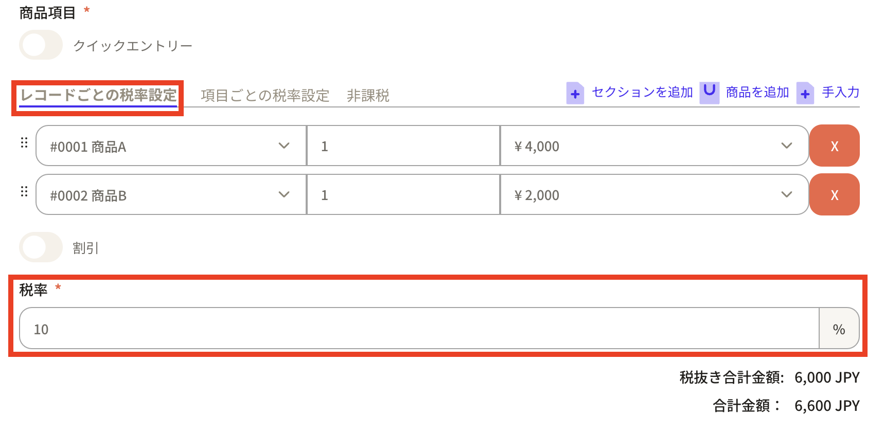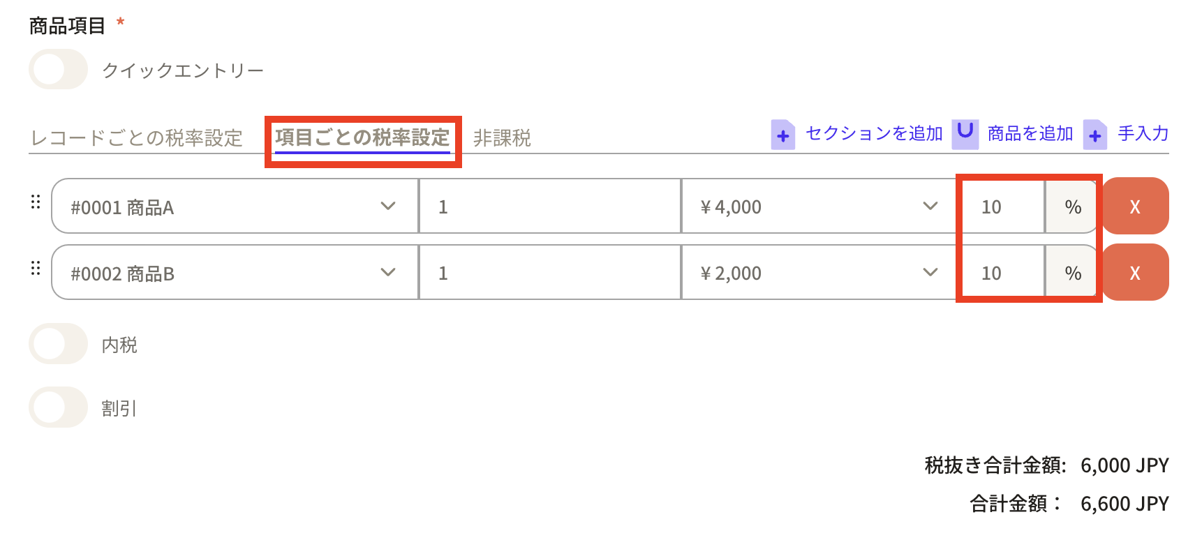 Example 2: Setting tax rate for each item