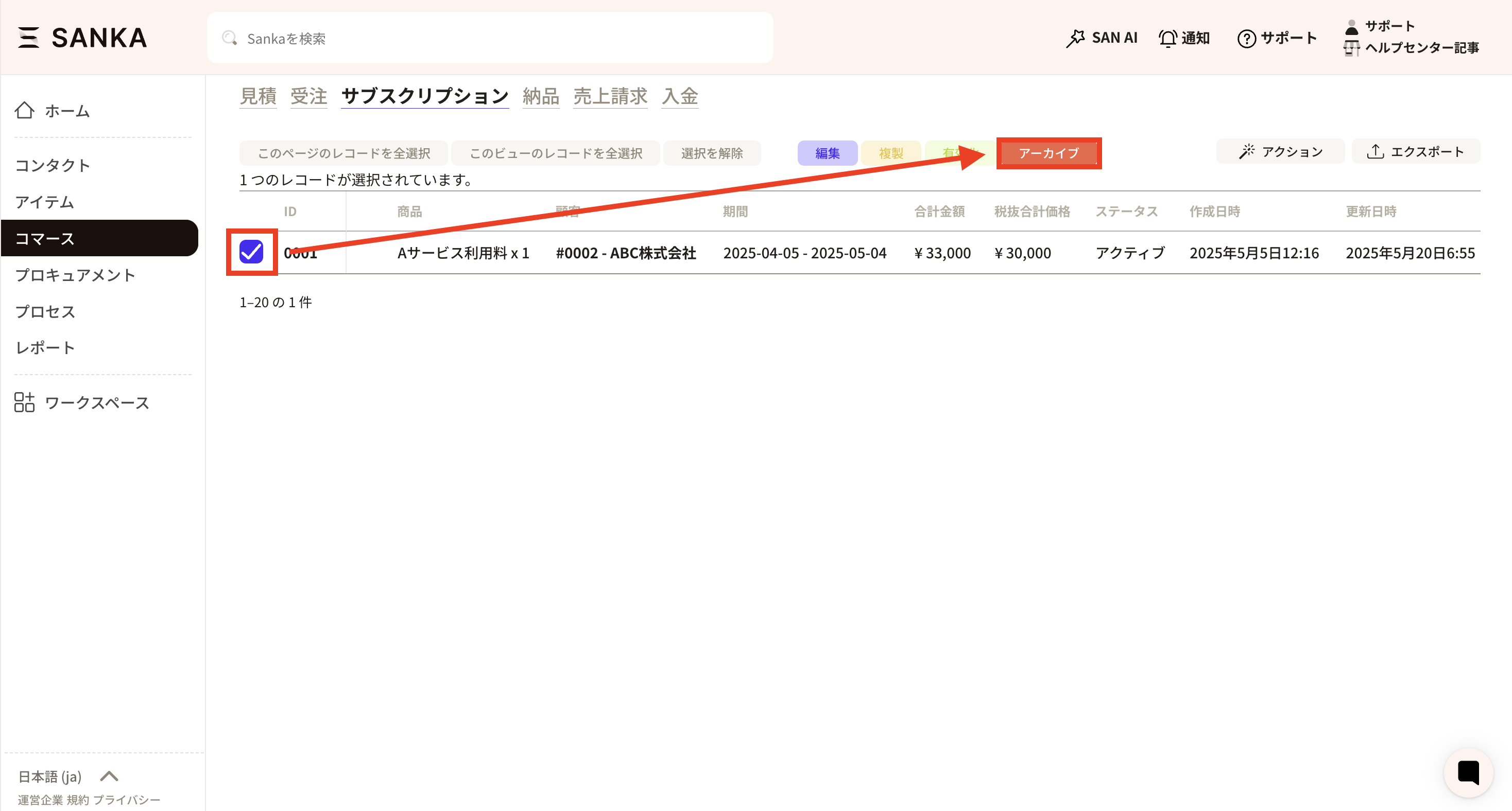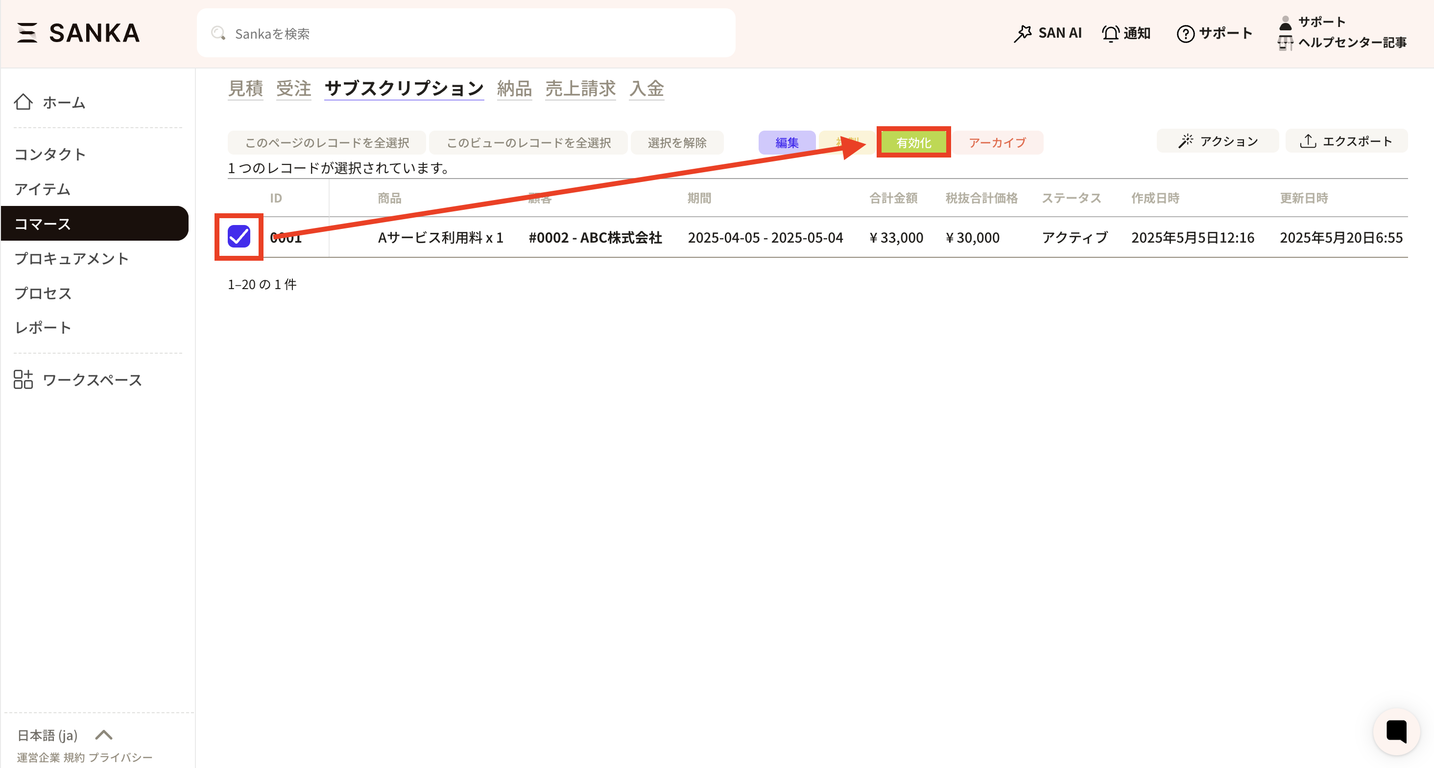⑤ A list of records that have been archived will be displayed. Click the box for the record and select "Enable."